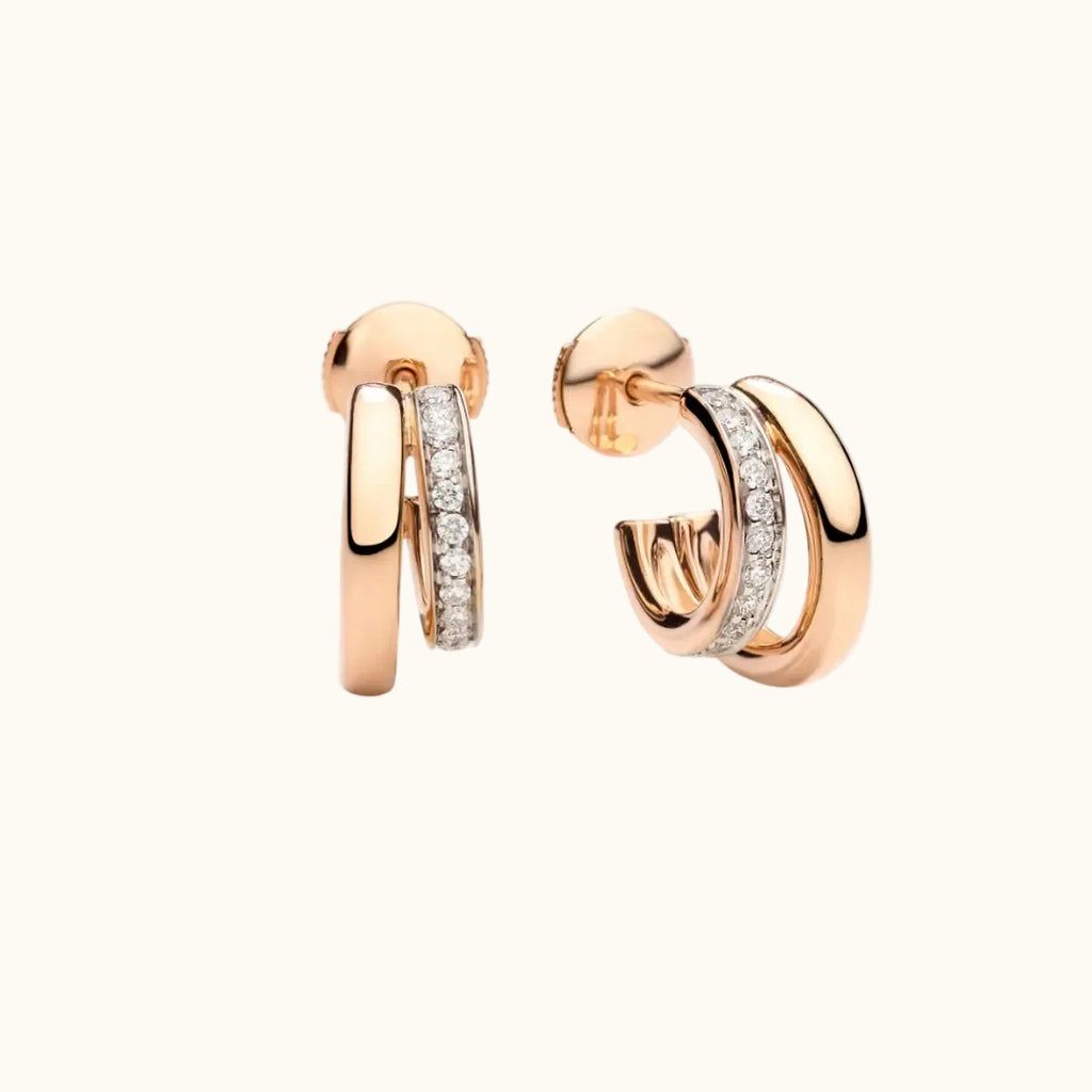 La collezione Armonia celebra l’incontro tra luce e design, trasformando il cerchio in un simbolo eterno di perfezione e completezza. Gli orecchini si compongono di due elementi in dialogo armonioso: il calore dell’oro rosa bombato e la brillantezza dei diamanti, incastonati a tutto giro su un cerchio complementare. Un dettaglio romantico rende questi gioielli ancora più speciali: la chiusura a farfallina, delicatamente sagomata a forma di cuore, aggiunge un tocco di dolcezza al design, unendo funzionalità e poesia in ogni indosso. Perfetti per illuminare ogni occasione, incorniciano il volto con grazia ed eleganza.
