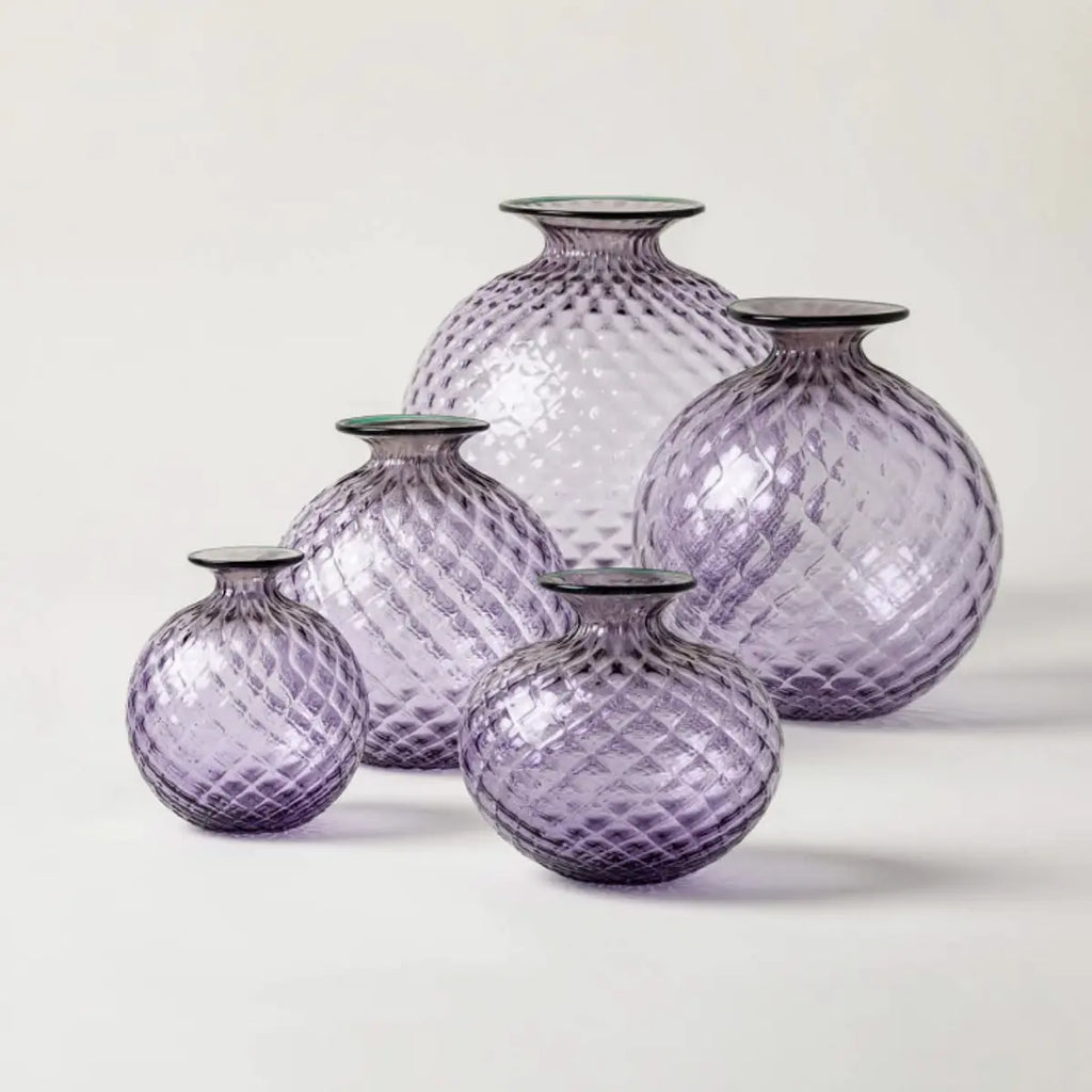 Ogni vaso è un pezzo unico, soffiato e lavorato interamente a mano dai maestri vetrai di Murano. La superficie Balloton viene creata attraverso un complesso processo che richiede precisione e esperienza: il vetro viene soffiato in uno stampo che imprime il caratteristico motivo a piccoli rombi in rilievo, mentre un filo colorato, applicato a caldo, definisce e impreziosisce il bordo superiore del vaso.