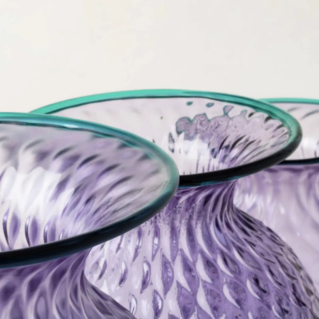 La nuance Lilla Menta, esclusiva di VENINI, trasforma questo vaso in un oggetto senza tempo che racchiude l'essenza della primavera veneziana: la delicatezza dei glicini in fiore si fonde con la freschezza del verde nuovo, creando un'armonia cromatica che parla di rinascita e di quella bellezza segreta che solo Venezia sa custodire.