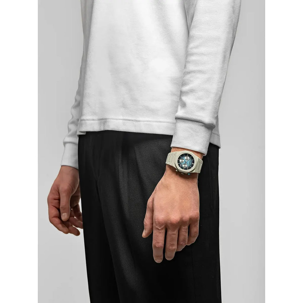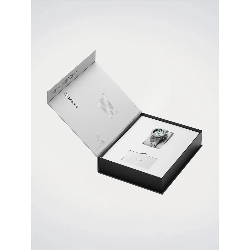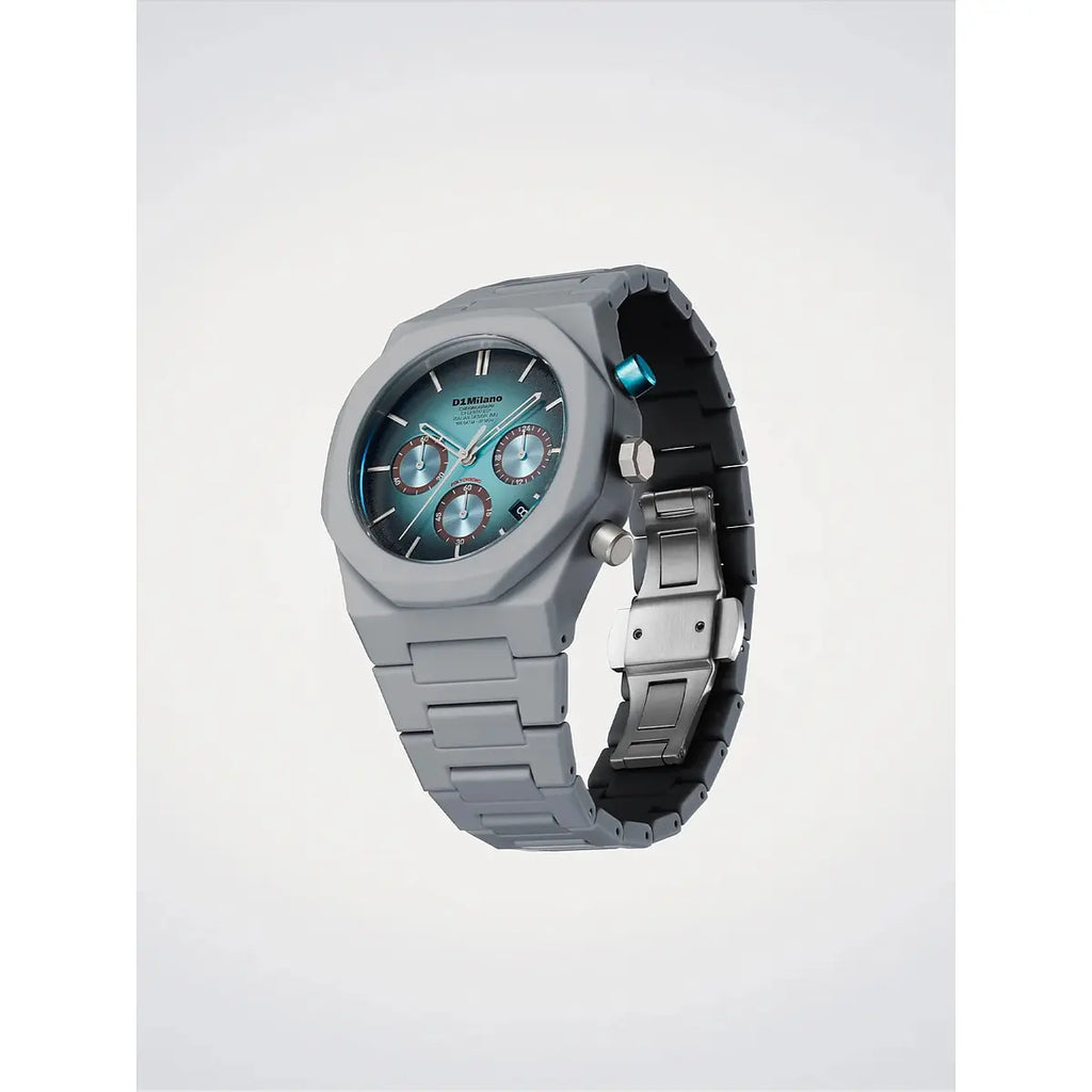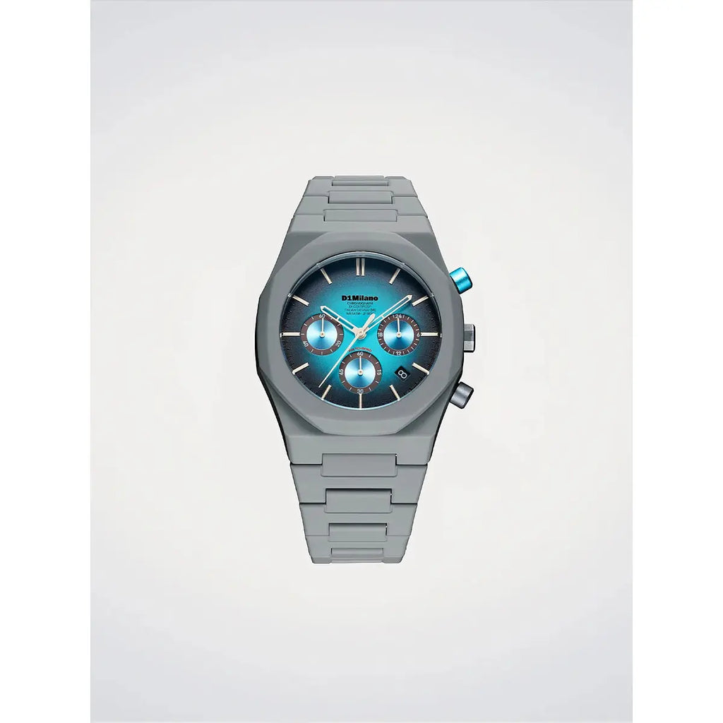 Audacia contemporanea e design visionario si fondono nell'orologio D1 Milano Polychrono Ice Phantom, un segnatempo che ridefinisce l'estetica urbana con la sua cassa ottagonale da 40.5mm in policarbonato taupe. Il quadrante opaco viola con sottoquadranti azzurro chiaro crea un contrasto cromatico sorprendente, protetto da un vetro minerale con trattamento anti-riflesso blu che amplifica la leggibilità in ogni condizione di luce. Il movimento al quarzo TMI VD53C a 3 lancette garantisce precisione affidabile, mentre il bracciale integrato in policarbonato e la chiusura a farfalla nascosta in acciaio assicurano comfort e praticità quotidiana. Con una resistenza all'acqua fino a 50 metri e un peso contenuto di soli 55 grammi, questo orologio Polychrono si rivela il compagno ideale per lo stile di vita dinamico dell'uomo contemporaneo. Un'espressione di orologeria italiana innovativa che sfida le convenzioni con personalità distintiva.