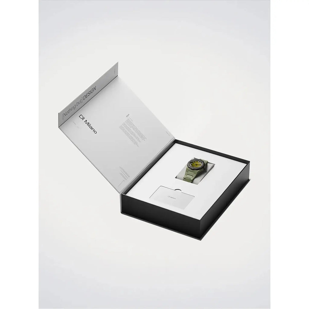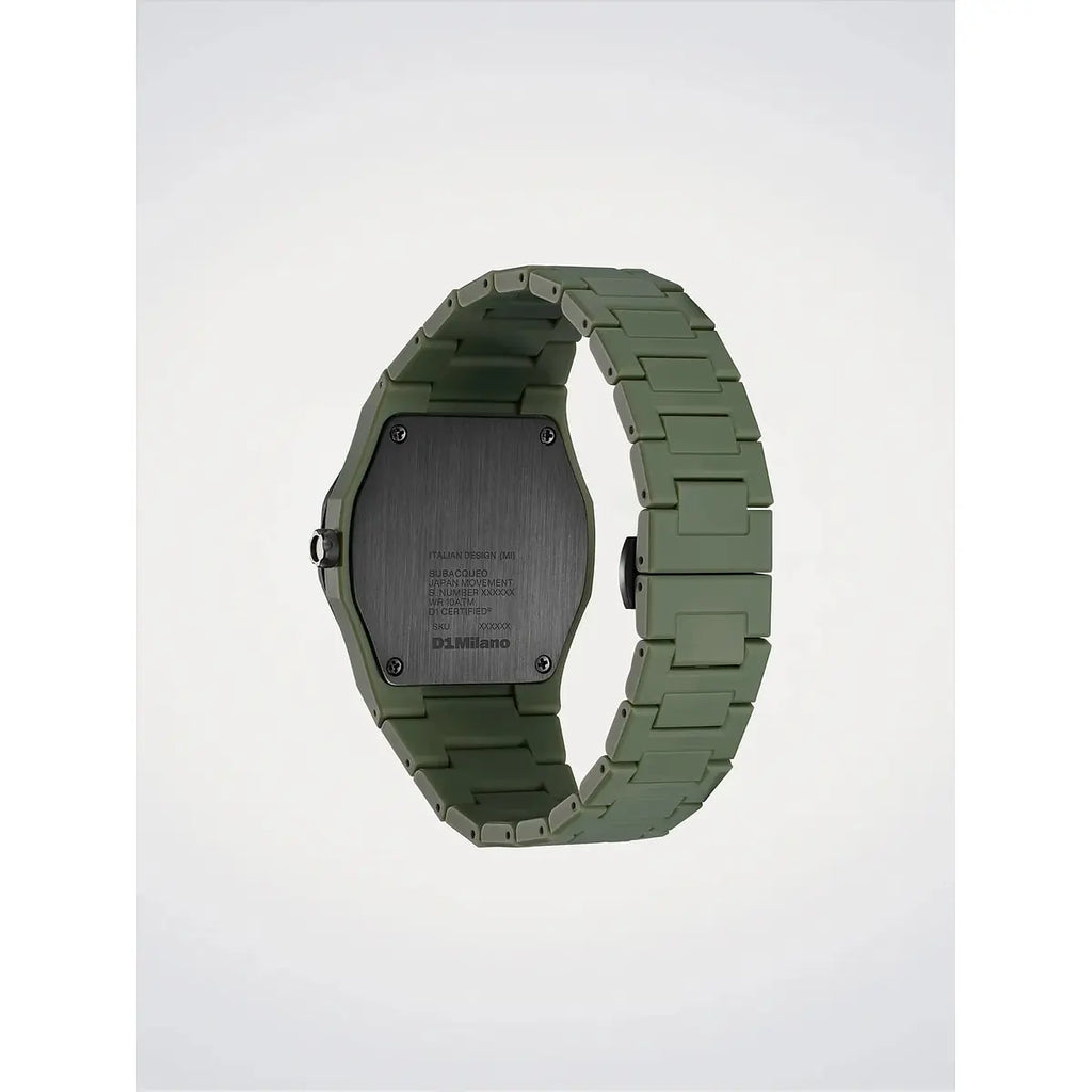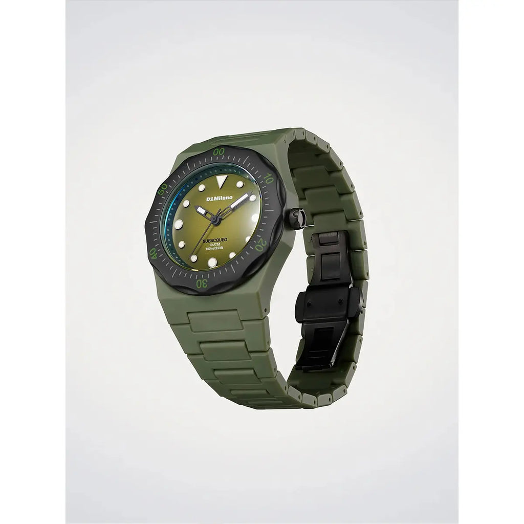 Un tuffo nell'essenza contemporanea del design italiano: il D1 Milano Polycarbon Diver Lagoon Drift reinterpreta l'orologeria subacquea con audacia innovativa. La cassa esagonale da 40.5mm in policarbonato verde militare racchiude un movimento al quarzo TMI VJ21 di precisione svizzera, mentre il quadrante verde con indici bastoni luminescenti e il vetro minerale con trattamento antiriflesso blu garantiscono leggibilità impeccabile in ogni condizione. Resistente fino a 10 ATM, questo segnatempo ultraleggero da 65g unisce sportività estrema e comfort assoluto grazie al bracciale integrato in policarbonato con chiusura a farfalla in acciaio. Perfetto per chi vive l'avventura urbana senza compromessi di stile, il modello Lagoon Drift della collezione Polycarbon Diver incarna lo spirito innovativo di D1 Milano, marchio milanese che ridefinisce i codici dell'orologeria sportiva contemporanea.