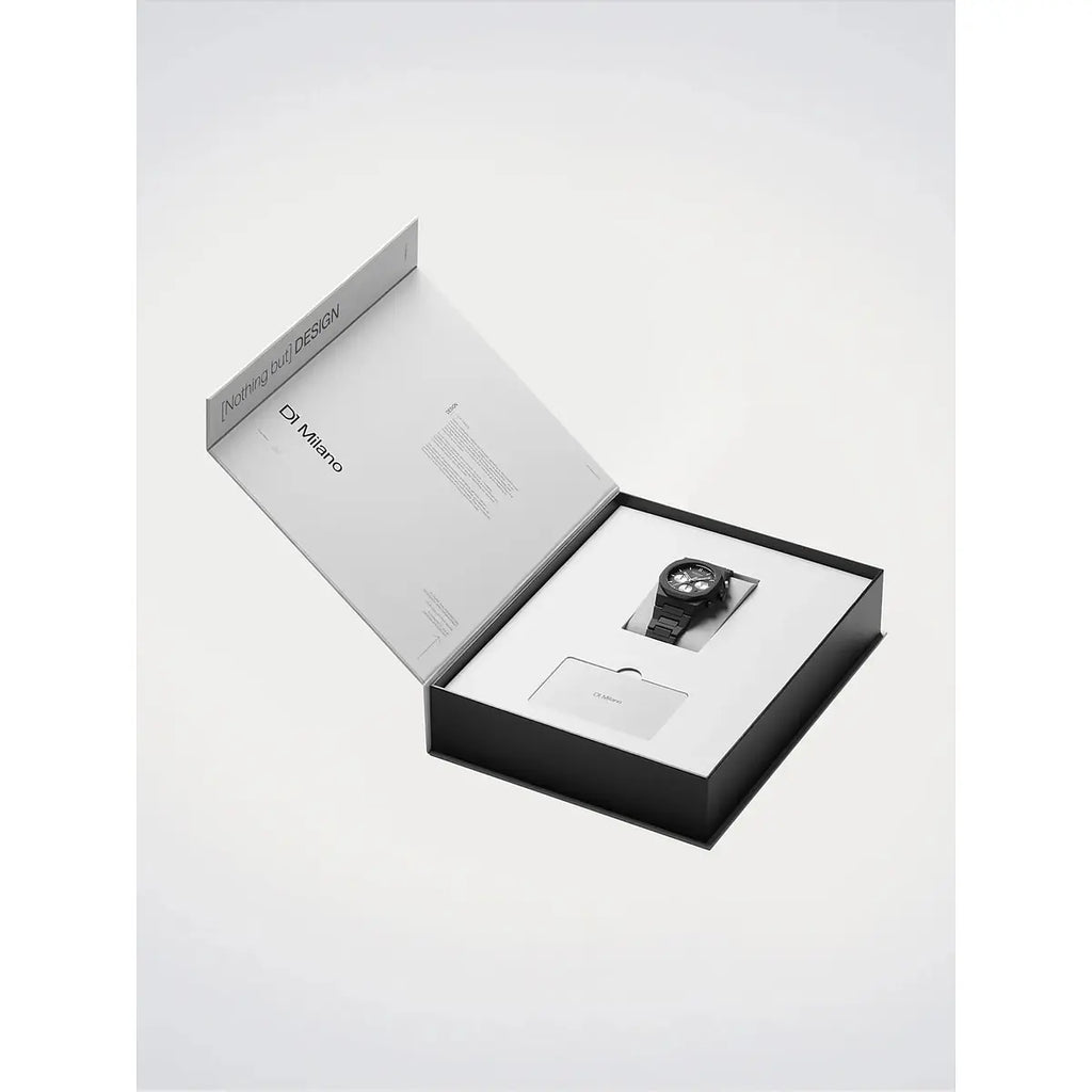 Espressione audace del design contemporaneo milanese, il D1 Milano Polychrono Gilded Lunar PHBJ15 reinterpreta l'orologeria con spirito innovativo. La distintiva cassa ottagonale in policarbonato nero da 40.5mm, spessa solo 11.5mm, racchiude un quadrante nero opaco impreziosito da sottoquadranti argentati e dettagli in ottone che catturano la luce con eleganza discreta. Il movimento al quarzo TMI VD53C garantisce affidabilità senza compromessi, mentre il vetro minerale con trattamento anti-riflesso blu protegge il cuore dell'orologio. Il cinturino integrato in policarbonato nero, dotato di chiusura a farfalla nascosta in acciaio inossidabile 316L, assicura comfort estremo e vestibilità perfetta grazie ai suoi 25mm di larghezza. Resistente all'acqua fino a 50 metri e con soli 55 grammi di peso, questo segnatempo casual si adatta senza sforzo alla vita urbana quotidiana, incarnando lo spirito contemporaneo del Made in Italy.