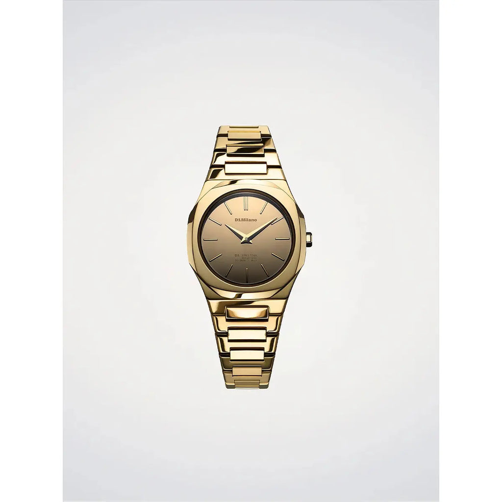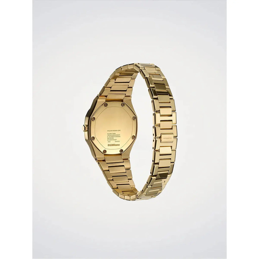 Un manifesto di minimalismo contemporaneo: l'orologio D1 Milano Ultra Thin Gold Gleam reinterpreta l'eleganza essenziale con una cassa ottagonale in acciaio 316L da 30mm, rivestita in prezioso PVD oro che cattura la luce in riflessi luminosi. Il quadrante specchiato giallo oro, protetto da cristallo zaffiro con trattamento anti-riflesso blu, dialoga armoniosamente con il bracciale integrato in acciaio lucidato e rivestimento PVD, creando un gioco di superfici che esalta la straordinaria sottigliezza di soli 6.45mm. Il movimento al quarzo Miyota GL22 garantisce precisione affidabile, mentre la chiusura a farfalla nascosta preserva la purezza delle linee. Resistente fino a 5 ATM, questo segnatempo unisex da 67 grammi accompagna con discrezione sofisticata ogni momento della giornata, dall'ufficio alle occasioni serali. Un'icona di design milanese che celebra l'arte della sottrazione e la bellezza dell'oro contemporaneo.