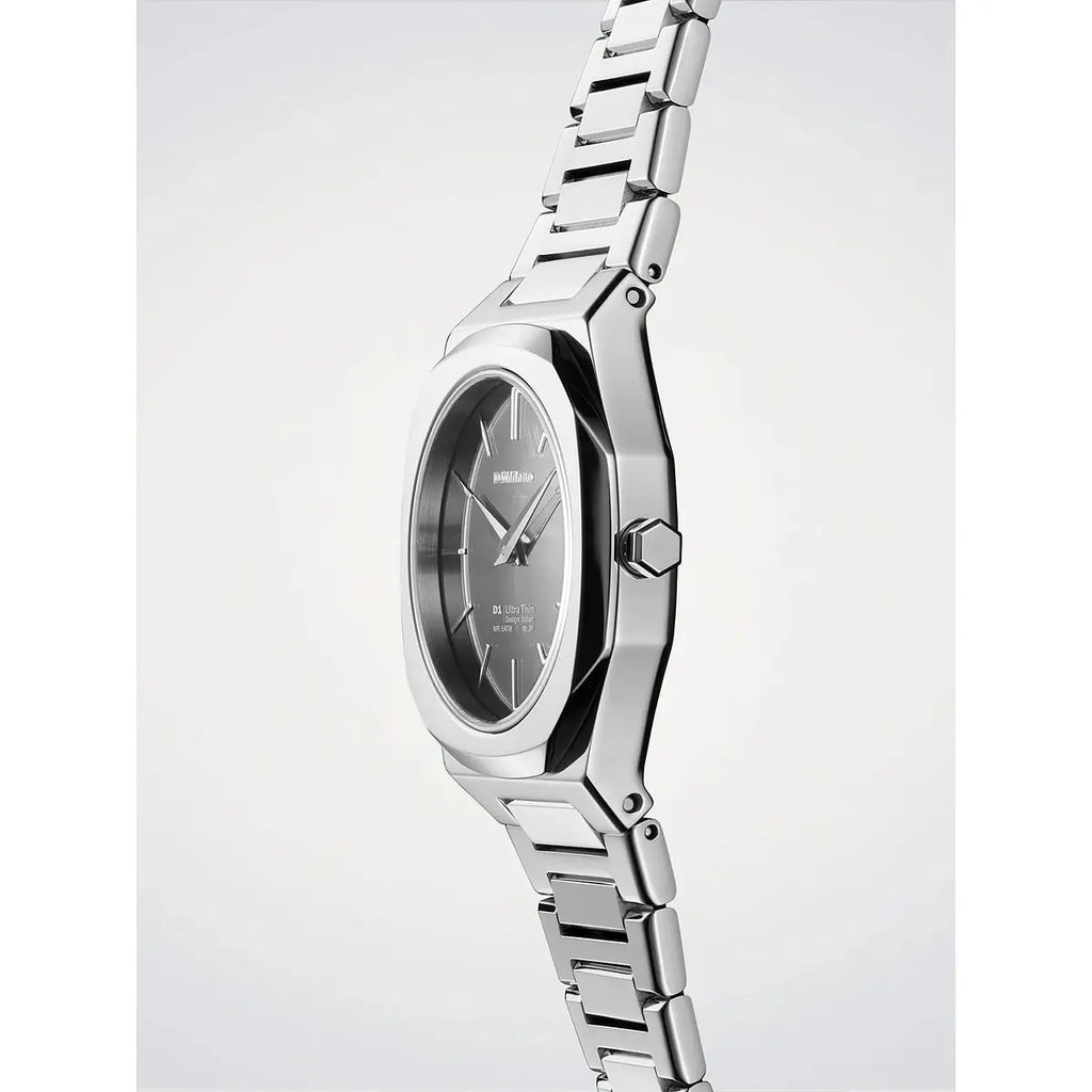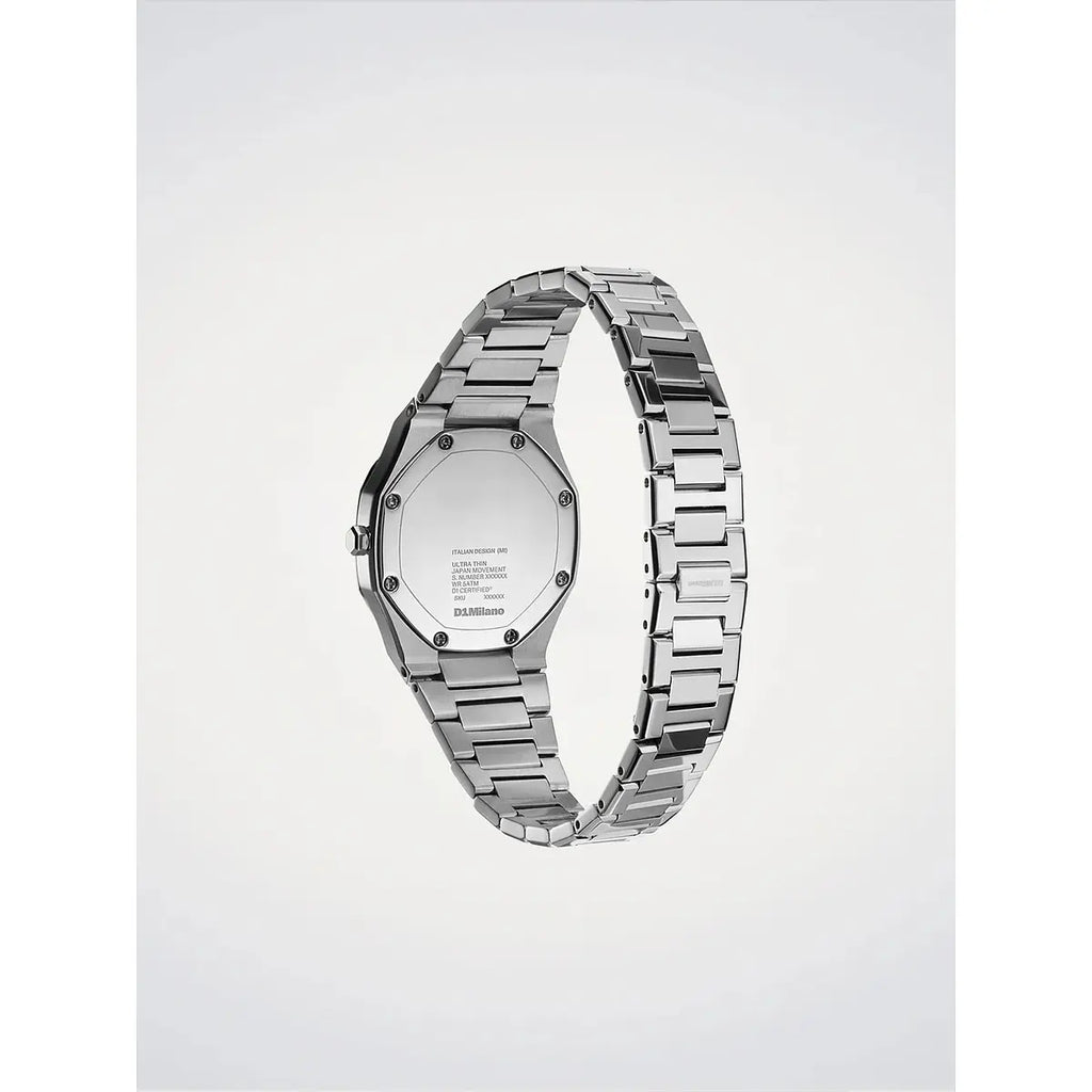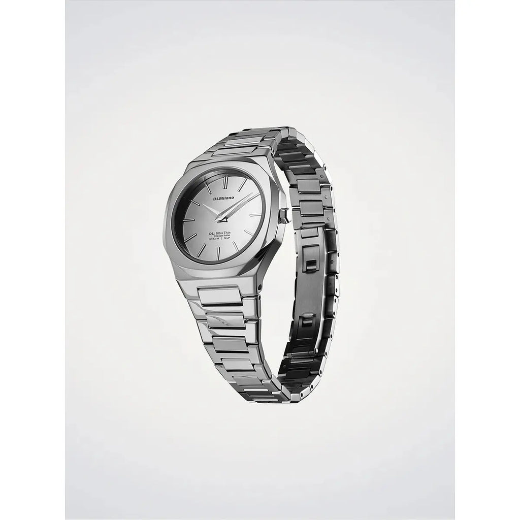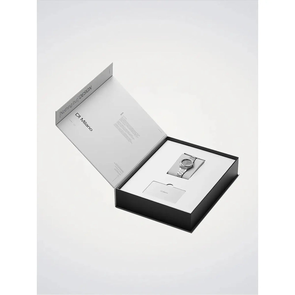 L'essenza del design minimalista milanese: l'orologio D1 Milano Ultra Thin Silver Gleam interpreta l'eleganza contemporanea con una cassa in acciaio inossidabile 316L di soli 30mm di diametro e uno spessore straordinario di appena 6,45mm. Il quadrante grigio a specchio, protetto da cristallo zaffiro con trattamento antiriflesso blu, crea giochi di luce sofisticati grazie alla finitura mirror silver della cassa e del bracciale in acciaio lucido. Il movimento al quarzo Miyota GL22 garantisce precisione assoluta, mentre la chiusura a farfalla nascosta assicura comfort discreto al polso. Impermeabile fino a 50 metri, questo segnatempo da 67 grammi unisce leggerezza e resistenza, perfetto per valorizzare ogni momento della giornata con stile raffinato. Un'icona dell'orologeria italiana che celebra la purezza delle linee e l'eccellenza dei materiali.