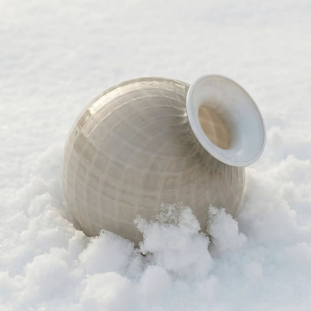 Un capolavoro di illusione firmato Venini: il vaso Balloton Mini ricrea con maestria l'effetto matelassé nel vetro soffiato a mano, dove ogni superficie sembra morbida al tatto pur conservando la cristallina solidità del materiale. La lavorazione Balloton del 2016 si esprime in tonalità bianco snow e cristallo con finitura lucida, impreziosita da un filo colorato applicato a caldo che racchiude il decoro come un gioiello. Con i suoi 12,5 cm di altezza e 11 cm di diametro, questo monofiore rappresenta l'eccellenza vetraria muranese: perfetto per valorizzare un singolo stelo o come scultura decorativa che cattura la luce, trasformando ogni ambiente in uno spazio di raffinata eleganza italiana.