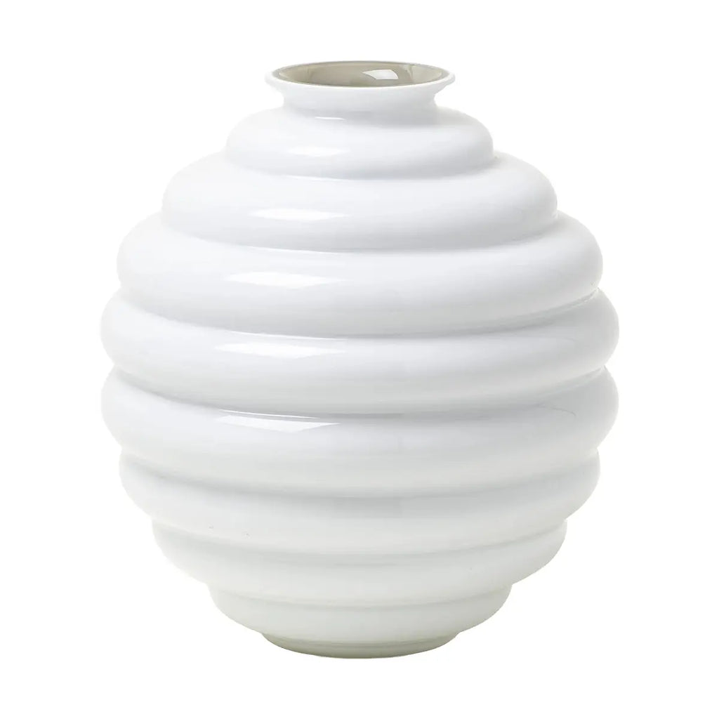 Il vaso Deco Medio di Venini interpreta il movimento attraverso il vetro soffiato: anelli concentrici si susseguono in un ritmo ipnotico, evocando cerchi nell'acqua e riflessi luminosi. Nato nel 1930 dalla maestria vetraria muranese, questo capolavoro in vetro opalino bianco snow conquista per la finitura lucida e la forma geometrica che gioca con la luce. Compatto nelle dimensioni – 4 cm di altezza, 3 cm di diametro – ma sostanziale nel peso di 1,8 kg, testimonia la qualità della lavorazione artigianale italiana. Perfetto come accent piece vintage su consolle o librerie contemporanee, trasforma ogni superficie in una composizione d'arte.