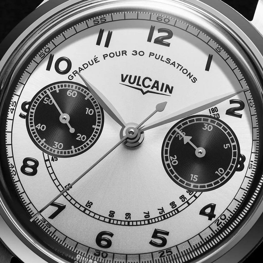Il Monopusher Heritage Panda reinterpreta fedelmente l'iconico cronografo degli anni '50, preservando ogni elemento estetico dell'originale. Il quadrante bianco sunburst con contatori neri mantiene i numerali e gli indici caratteristici, mentre sotto l'emblema Vulcain a ore 12 la scritta "Chronomètre" testimonia l'autenticità della concezione. La scala pulsometrica, annotata in francese con "Graduated for 30 pulsations", rappresenta un dettaglio affascinante che rimanda ai cronografi medicali dell'epoca, quando la misurazione del battito cardiaco era una pratica essenziale.