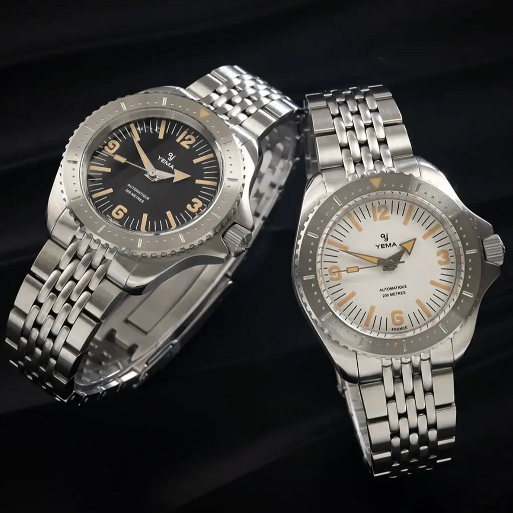 L'essenza del diving watch classico rivive nel YEMA Diver con quadrante nero. La profondità del quadrante opaco sabbiato crea un contrasto perfetto con gli indici e le lancette broad arrow rodiati, esaltando la leggibilità tipica degli orologi subacquei professionali. Il bracciale "beads of rice" in acciaio 316L aggiunge un tocco di raffinatezza vintage a questo strumento professionale.