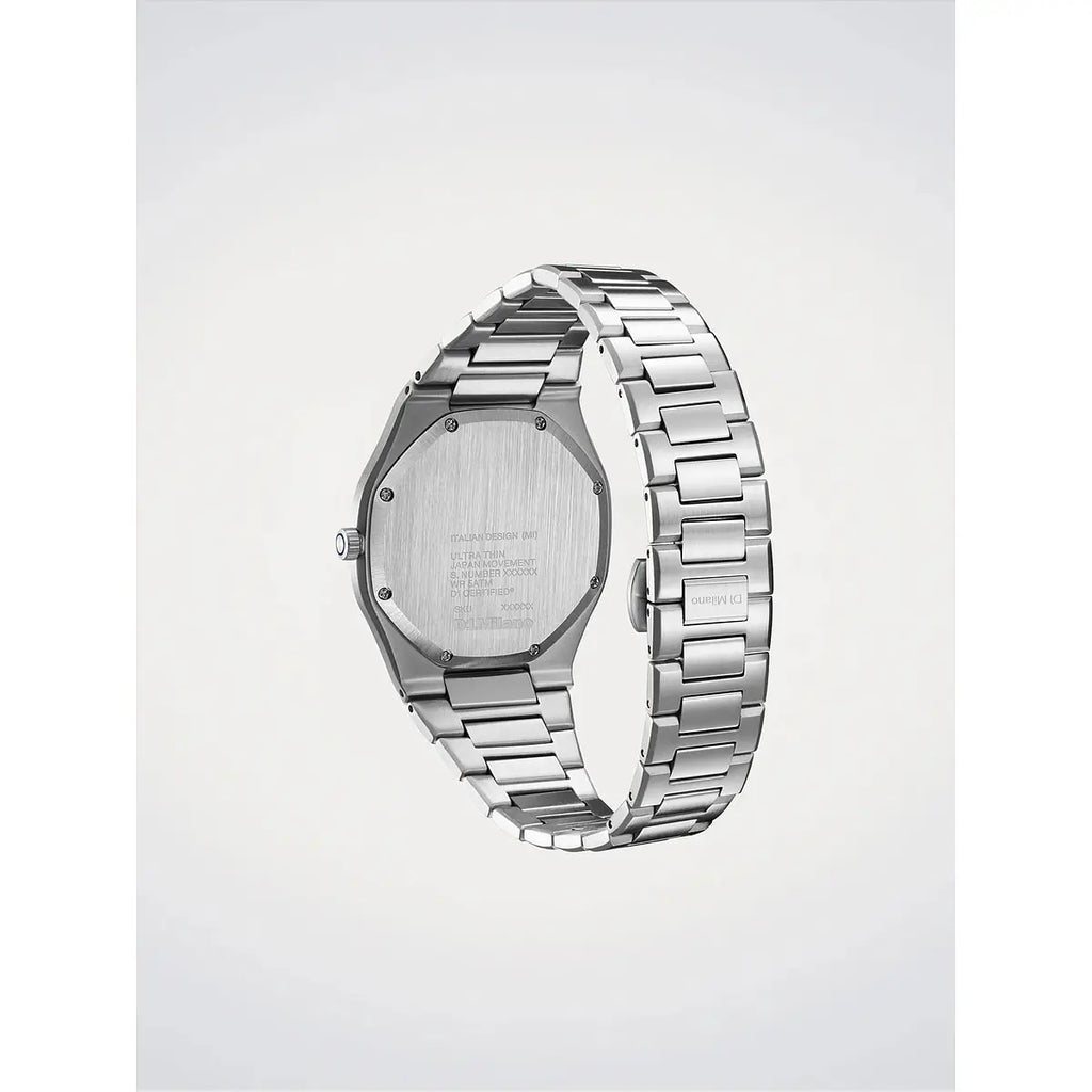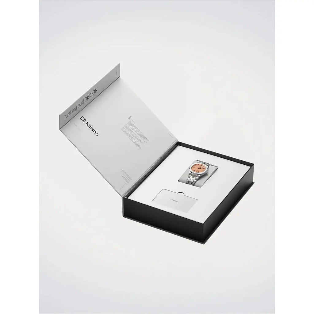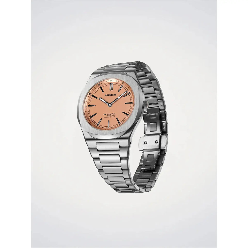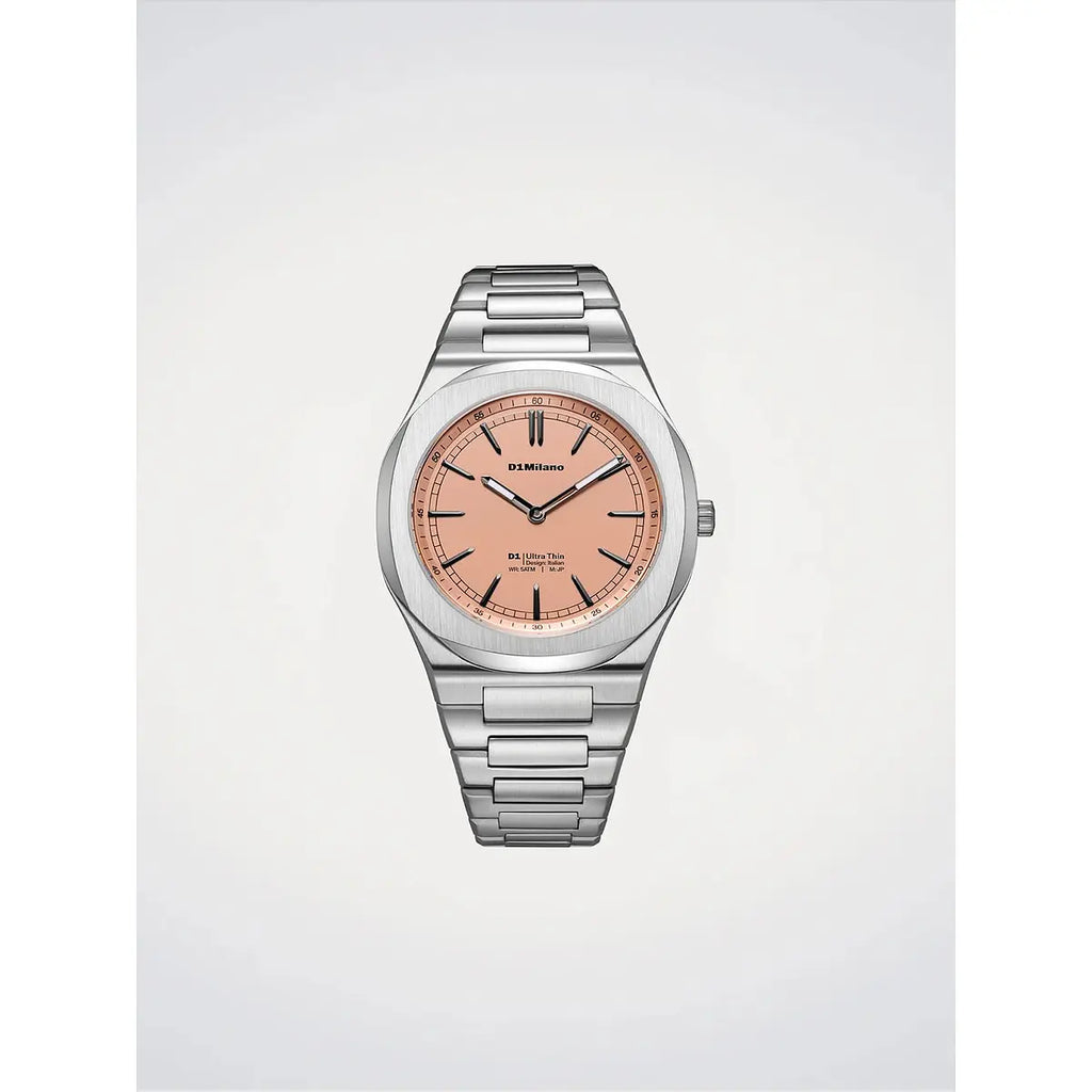 Un manifesto di eleganza minimalista: l'orologio D1 Milano Ultra Thin Neutral Heritage reinterpreta il concetto di raffinatezza contemporanea con il suo esclusivo quadrante rosa sabbiato che cattura la luce con delicata intensità. La cassa ultra-sottile da soli 6,3mm in acciaio inossidabile 316L, con diametro di 39mm, si fonde armoniosamente con il bracciale integrato in acciaio, creando una silhouette fluida e sofisticata al polso. Il vetro zaffiro con trattamento antiriflesso blu protegge il movimento al quarzo Miyota GL22, mentre la chiusura a farfalla nascosta garantisce comfort e discrezione. Le lancette dauphine e gli indici a bastoni in ottone esaltano la purezza del design, mentre la resistenza all'acqua fino a 50 metri assicura versatilità quotidiana. Perfetto per chi cerca un segnatempo unisex che bilancia funzionalità tecnica e sensibilità estetica, questo modello della collezione Neutral Heritage incarna lo spirito contemporaneo di D1 Milano: essenziale, distintivo, senza compromessi.