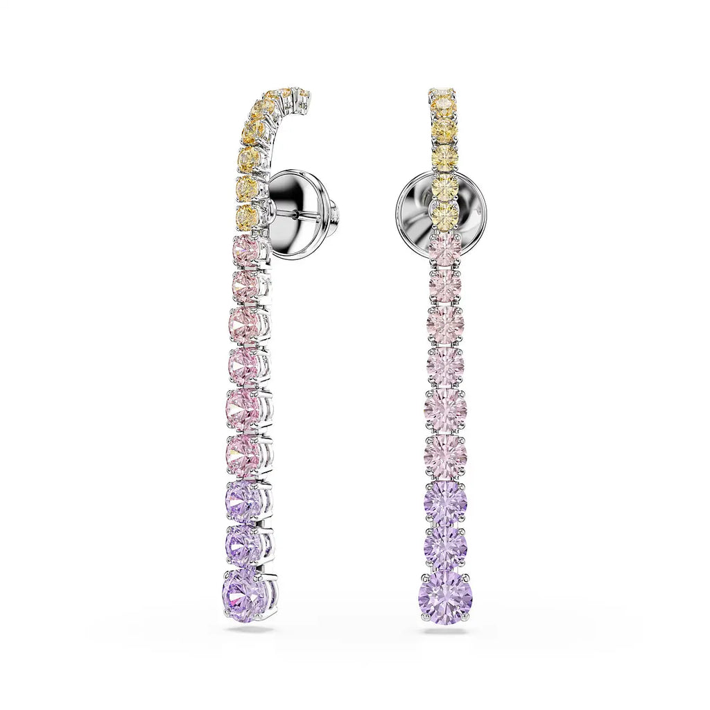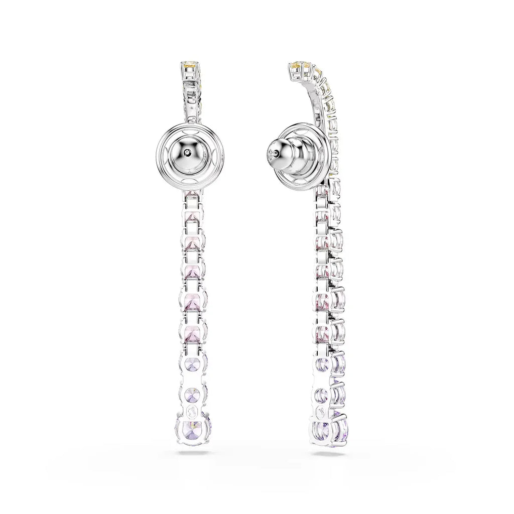 Un gioco di luce e colore che cattura l'essenza dell'eleganza contemporanea: gli orecchini pendenti Swarovski della collezione Matrix trasformano il classico design tennis in un'espressione di raffinata vivacità. Ogni pezzo, impreziosito da una placcatura in rodio, sfoggia un filo luminoso di zirconi taglio brillante disposti in un affascinante degradé di tonalità rosa, viola e giallo pastello, con dimensioni graduate per un effetto visivo di straordinaria armonia. Le proporzioni slanciate di 5.2 cm di lunghezza e appena 0.5 cm di larghezza conferiscono un movimento fluido e leggero, perfetto per incorniciare il viso con riflessi cangianti. Ideali per una serata speciale o per elevare un look quotidiano, questi orecchini da donna si abbinano splendidamente ai pezzi coordinati della stessa collezione. Un accessorio firmato Swarovski che celebra la maestria nella lavorazione dei cristalli con inconfondibile stile.